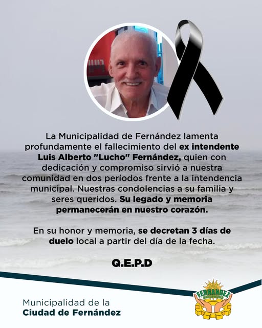 Por ello, la Municipalidad de Fernández emitió un comunicado donde : "lamenta profundamente el fallecimiento del ex intendente Luis Alberto "Lucho" Fernández, quien con dedicación y compromiso sirvió a nuestra comunidad en dos períodos frente a la intendencia municipal. Nuestras condolencias a su familia y seres queridos. Su legado y memoria permanecerán en nuestro corazón. En su honor y memoria, se decretan 3 días de duelo local a partir del día de la fecha"